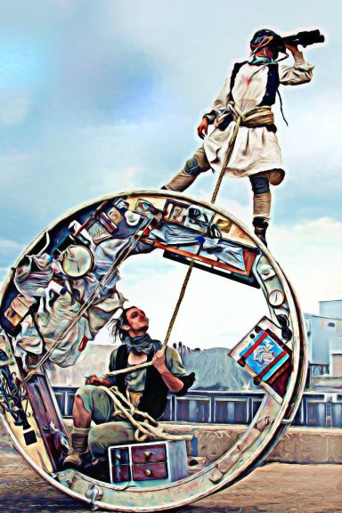 המשכתי למופע אחר – ווילהאוס (the wheel house) , או בתרגום חופשי "בית הגלגל" של קרקס Acrojou הבריטי. מופע של גבר ואישה הנעים בתוך גלגל שהוא ביתם והאפיונים שלו הם על זמניים – שעון מחוגים, כביסה תלויה על חבל, שידת מדפים והכל כאילו מאיזה עולם אחר, לא מוכר, כולל הלבוש שלהם. את כל האינטראקציה ביניהם כזוג ועם העולם הסובב אותם הם מקיימים בתוך ומתוך הגלגל, תוך שהם מתגלגלים זה בזה, בתוך הגלגל. בתחילת המופע הם ממש מתגלגלים, כשהקהל עמם, אל עבר אזור ההצגה ובתומה מתגלגלים בחזרה אל נקודת המוצא, כך הכינוי מעשייה אקרובטית בהחלט תואם את האירוע. לצערי חווית הצפייה שלי הייתה כה מתסכלת עקב ההליכה הצפופה של הקהל והקרבה לגלגל עצמו שאפשרו לראות רק מבעד לשערות של זה שנעמד לפנייך ושל זו ששלחה את הילדים קדימה והם קצת דרכו עלייך בדרך ונותרת מאחור… אך ממה שהצלחתי לתפוס ולהקשיב אכן מדובר במופע קצר וקסום.