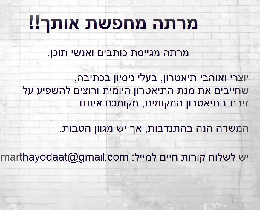 פברואר 24, 2013פברואר 24, 2013marthayodaatלהשאיר תגובה בנושא מרתה מחפשת אותך! מרתה מחפשת אותך! לגלות עוד מהאתר מרתה יודעת יש להירשם לעדכונים כדי לקבל את הפוסטים האחרונים לאימייל שלך. עליך להקליד את האימייל שלך… להירשם שתף לשתף ב-X (נפתח בחלון חדש) X שתף בפייסבוק (נפתח בחלון חדש) פייסבוק אהבתי טוען... קשור