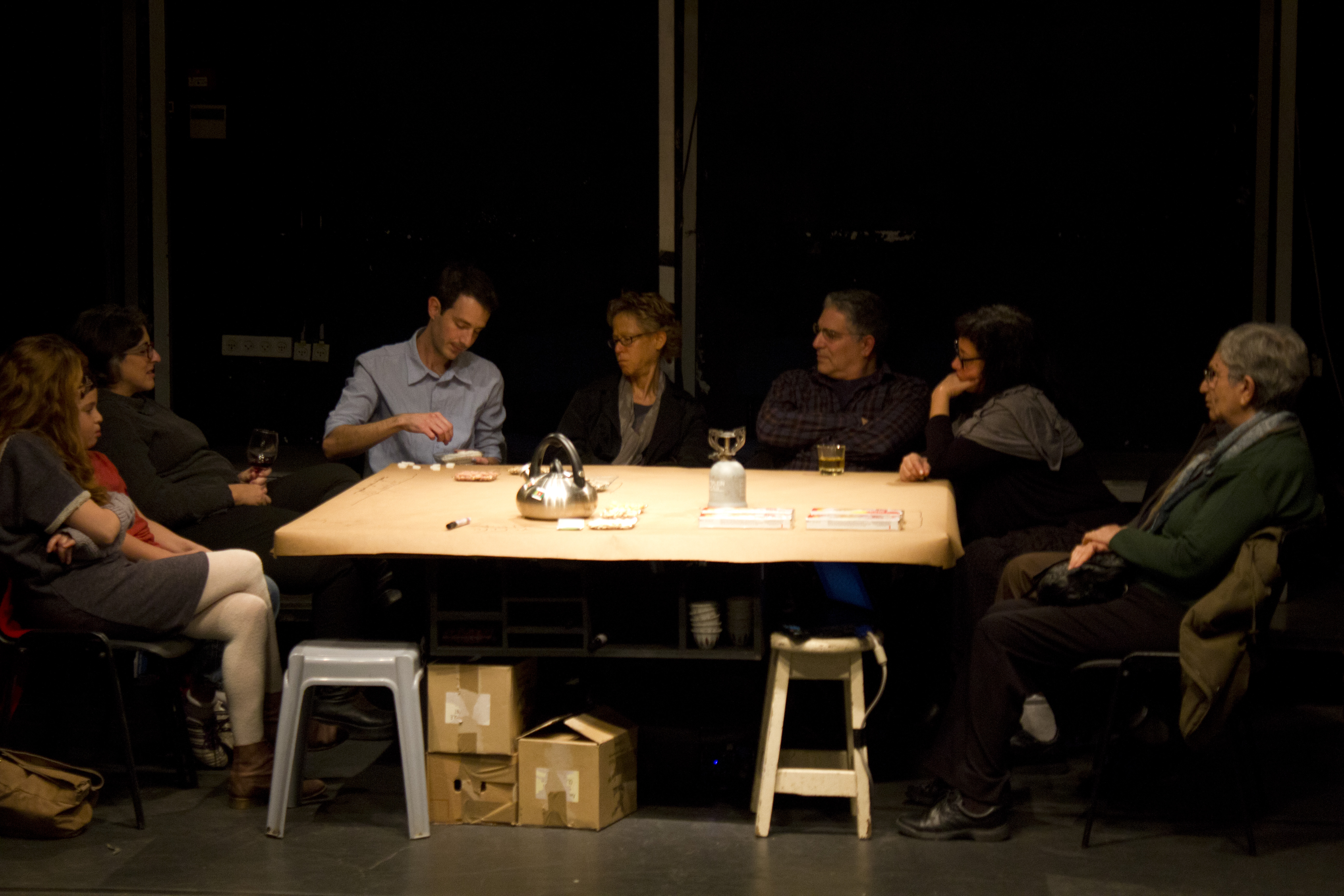 אני מתיישב באופן אקראי למדי ליד שולחן מסוים, סתם כי הוא הכי קרוב לכניסה, ואז בעצם מתחילה ההצגה. ללא כיבוי אורות, ללא הודעה רשמית של כיבוי פלאפונים ומצפצפים אחרים. הצופים מסתכלים אחד לשני בעיניים והיוצרים מתחילים לארח ולספר.