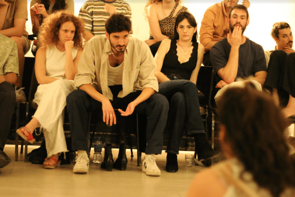 היצירה "לא מדויק" של נעמה מנור ורוני ברנט, המתהדרת בכותרת "הטרגדיה הזוגית של דור ה-Y", מהווה כאירוע פופ-אפ תיאטרוני חדש שעומד להופיע בפאבים שונים ברחבי הארץ – כל פעם במקום אחר. הבכורה שאני ראיתי התקיימה ב"תדר – בית התרבות של סולידאריות", בתל אביב. החלל, שמעולם לא הייתי בו, לא נראה כמו פאב בכלל. הכיסאות היו מסודרים במעגל, לא היה אף שולחן, והבר היחיד היה בפינה של החדר ומכר רק בירה ויין. לא פאב קלאסי, אבל בטח לא הצגה קלאסית. שלושת השחקנים כבר רקדו בתוך הרחבה העגולה, מחכים עד שכל הקהל יתיישב. ואז, כאילו משום מקום, מחיאות כפיים החלו, וגם ההצגה.