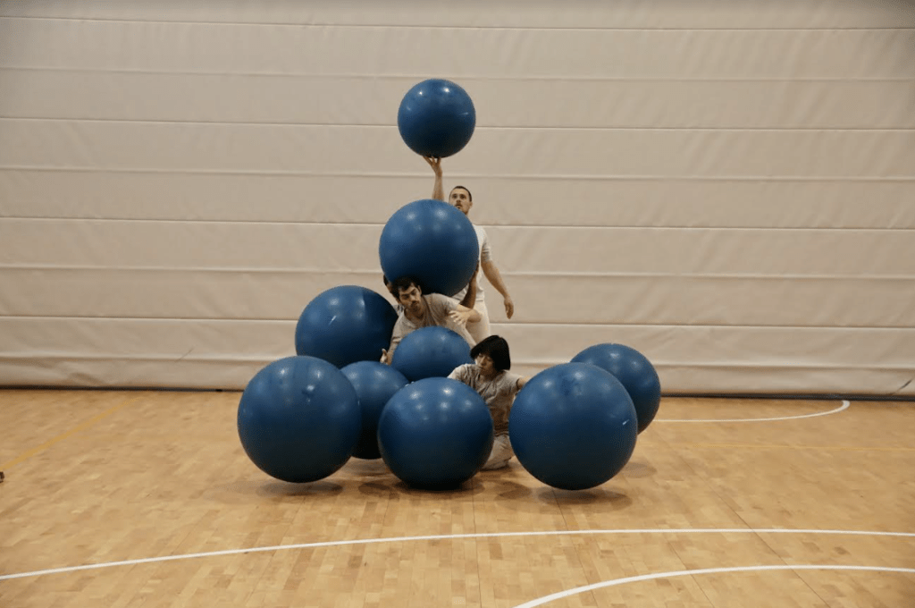 כוכבי היצירה הם עשרה כדורים כחולים גדולים, כל אחד בגודל מעט שונה אך כולם מהסוג שמשמש לאימוני יוגה או פילאטיס, כלומר גדולים מדי לאחיזה נוחה ביד ואמורים לשמש לתרגול, לישיבה וכדומה. הכדורים מתחילים את ההצגה כשהם נחים על כיסאות פלסטיק לצד הבמה הריקה. שתי בנותיי שבאו איתי השתאו למראה ואחת מהן ציינה: "זה נראה כמו אולם התעמלות". עם החשכת האולם, נכנסים ארבעה שחקנים/רקדנים הלבושים לבן, טרנינג ארוך וקפוצ'ון המסתיר את פניהם. השחקנים מתחילים לגלגל את הכדורים אל הבמה, להתמסר בהם, להקפיץ אותם ולשחק בהם.