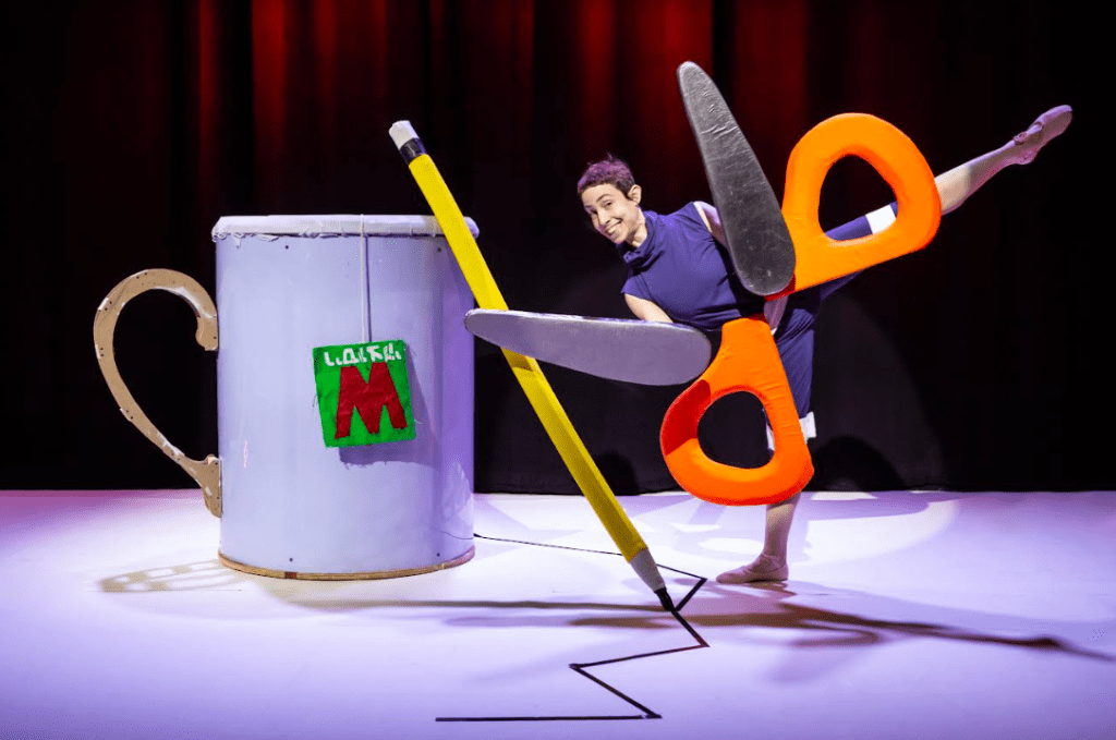 כך, לאורך היצירה "ספל, נייר ומספריים", קרן הופכת לגרסה מונפשת ומוגדלת של חפצים ופריטים אקראיים – מספריים, שעון, קן ציור ועוד הפתעות. לחפצים מערכות יחסים בינם לבין עצמם. המטאטא לא מנקה את הסבל, הרגל לא אוהבת לגרוב גרב, התיון פחדן… כל חפץ שמגיע תורו, בסוף מפשל. בין לבין, קרן חוזרת להיות היא ונותנת טקסט קצר בחרוזים שמקשר בין הקטעים השונים של החפצים.